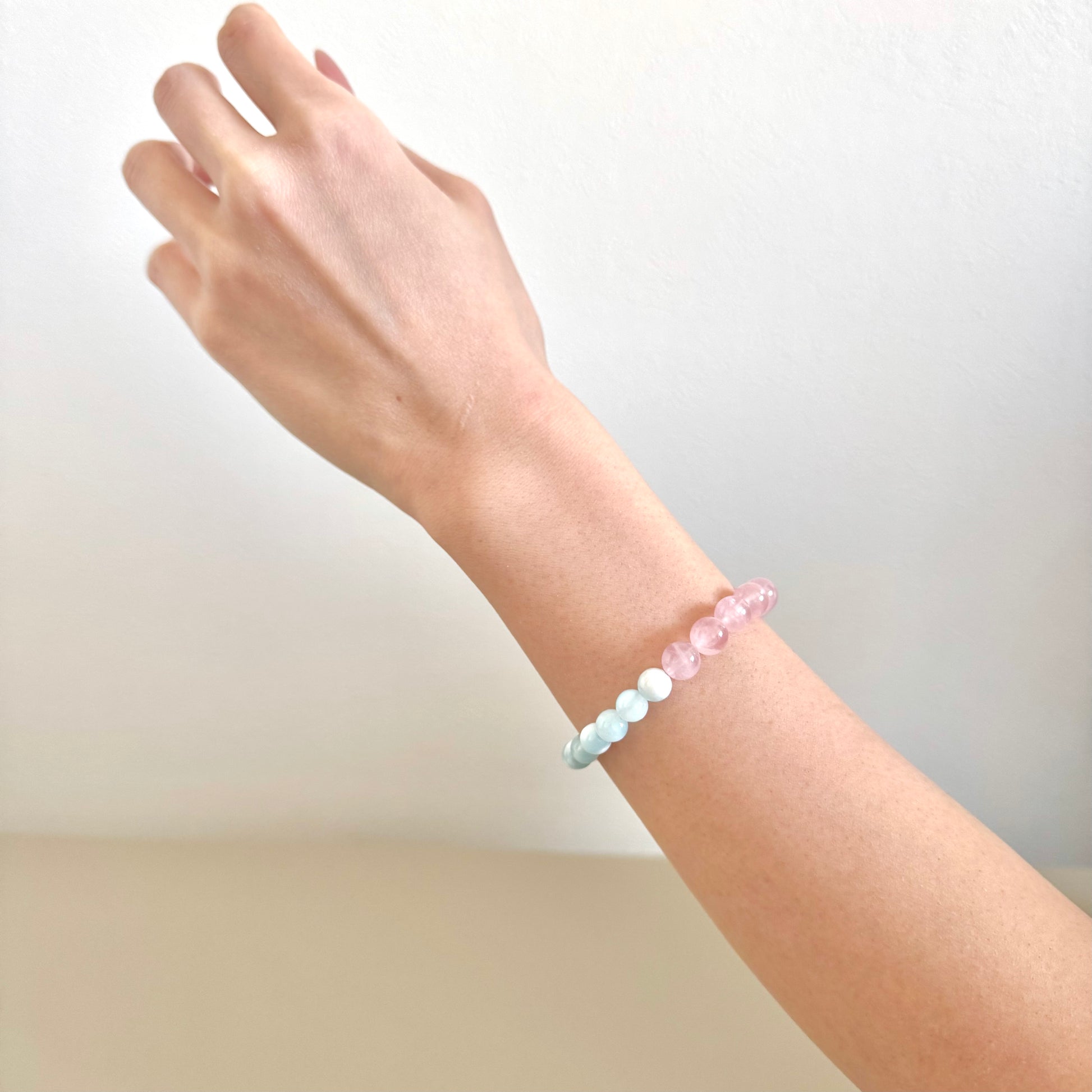 まるで空と花びらが手を取り合うように、アイスラリマーとローズクォーツが繊細に響き合い、ひとつのブレスレットになりました。